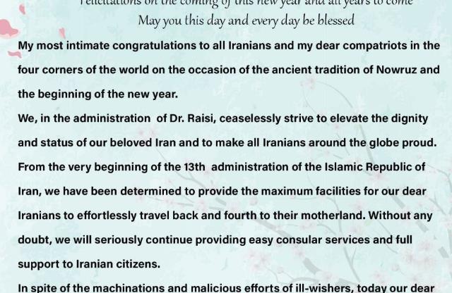 My most intimate congratulations to all Iranians and my dear compatriots in the four corners of the world on the occasion of the ancient tradition of Nowruz and the beginning of the new year.
