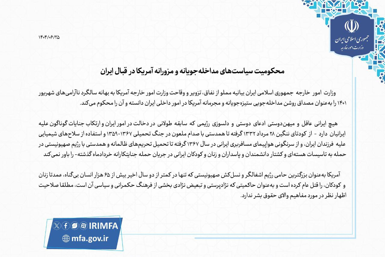 The Islamic Republic of Iran’s Foreign Ministry has condemned the US Department of State’s statement filled with hypocrisy, deceit, and audacity, issued on the anniversary of the September 2022 unrest, as a blatant example of America’s hostile and criminal interference in Iran’s internal affairs.